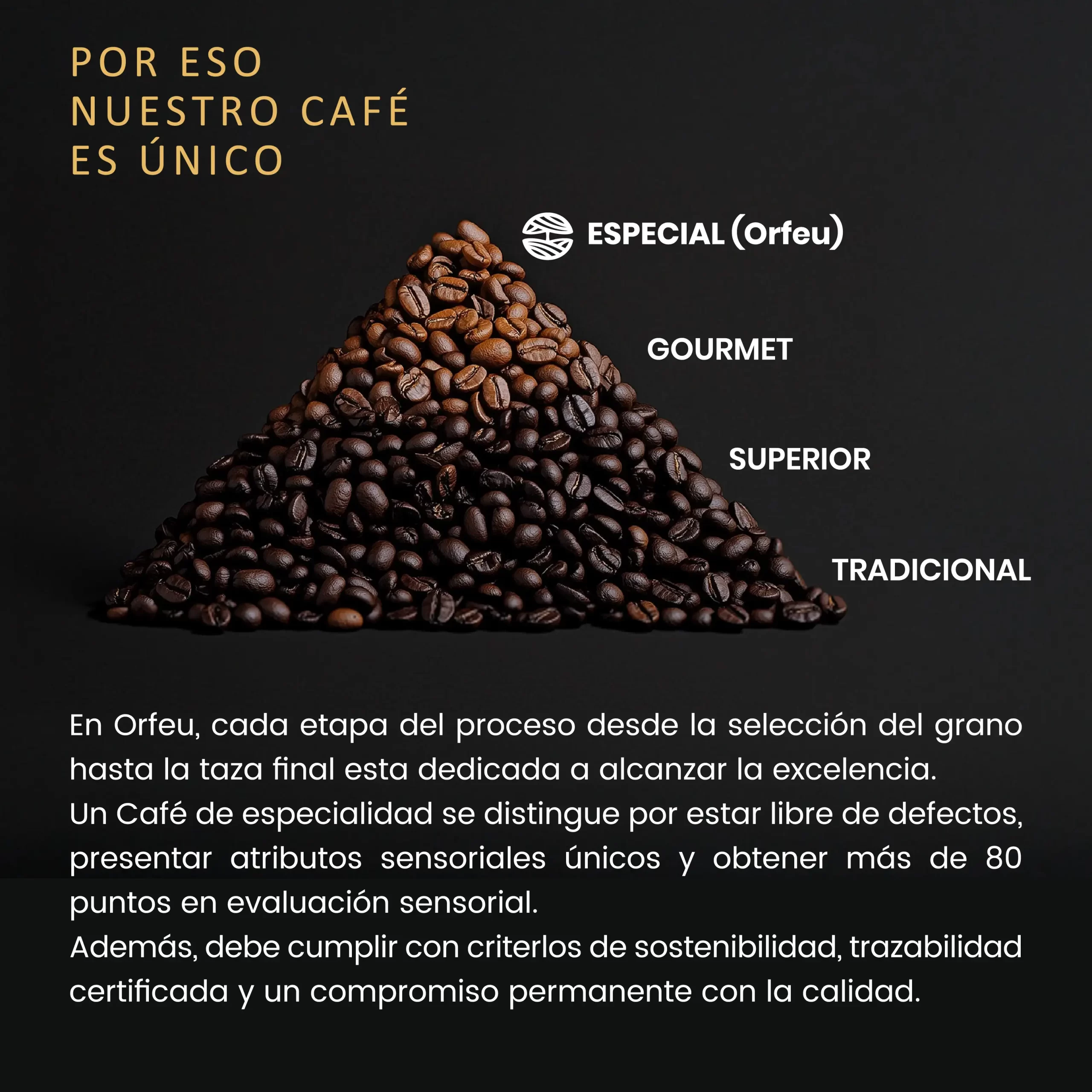 Con una intensidad 7, el Orfeu Descafeinado mantiene una presencia marcada y un perfil lleno de sabor, demostrando que un café sin cafeína también puede ofrecer una experiencia rica, intensa y sofisticada.