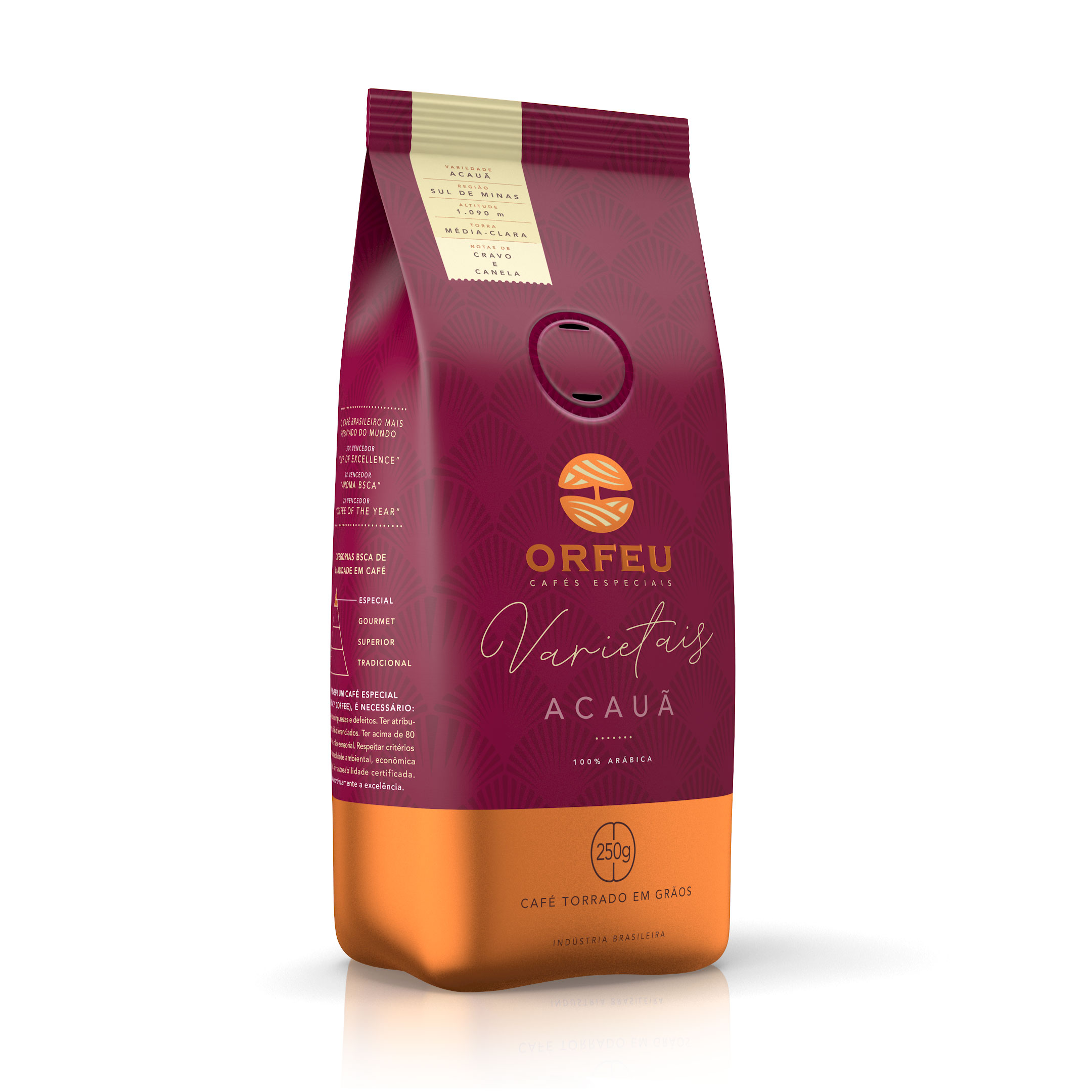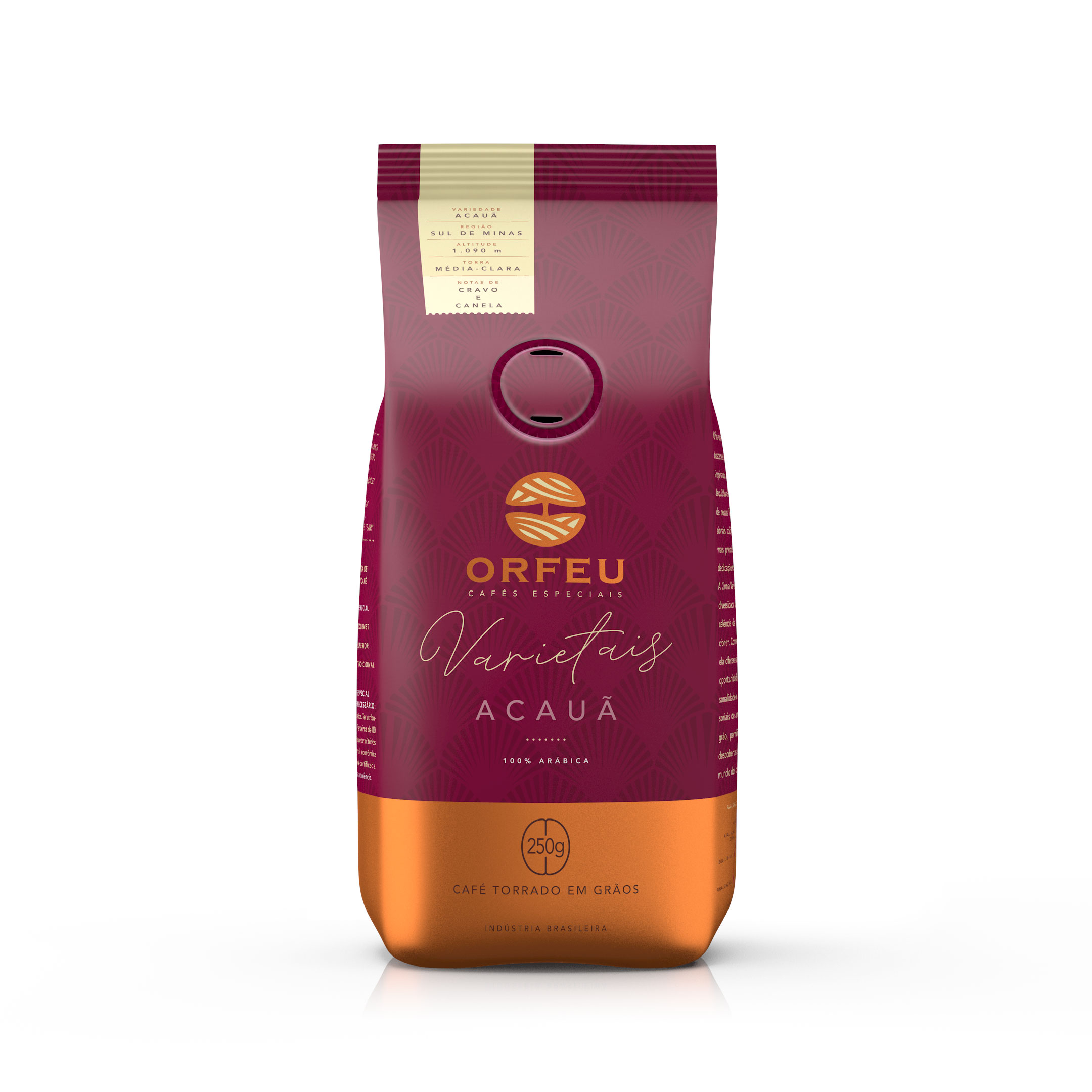 Café Orfeu Acauã de torrefacción media-clara, equilibrado y de cuerpo cremoso, con alta dulzura y acidez acentuada. Destaca por sus elegantes notas aromáticas de especias como clavo y canela. Intensidad 6, ideal para quienes buscan una taza intensa, cálida y aromática.