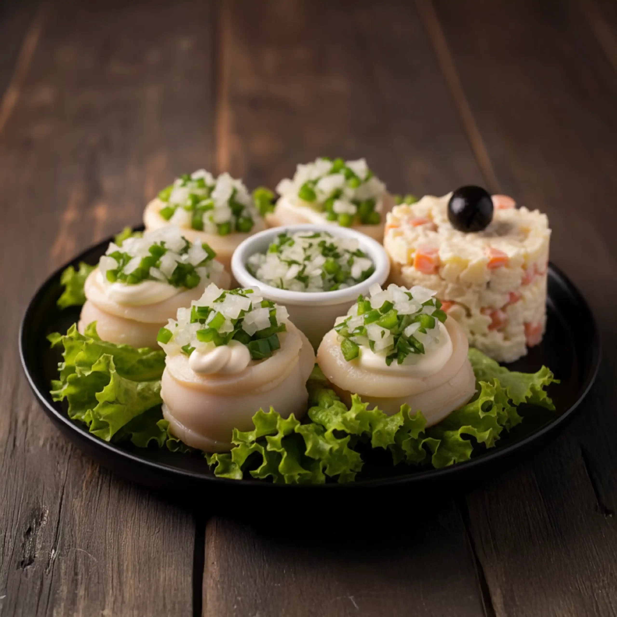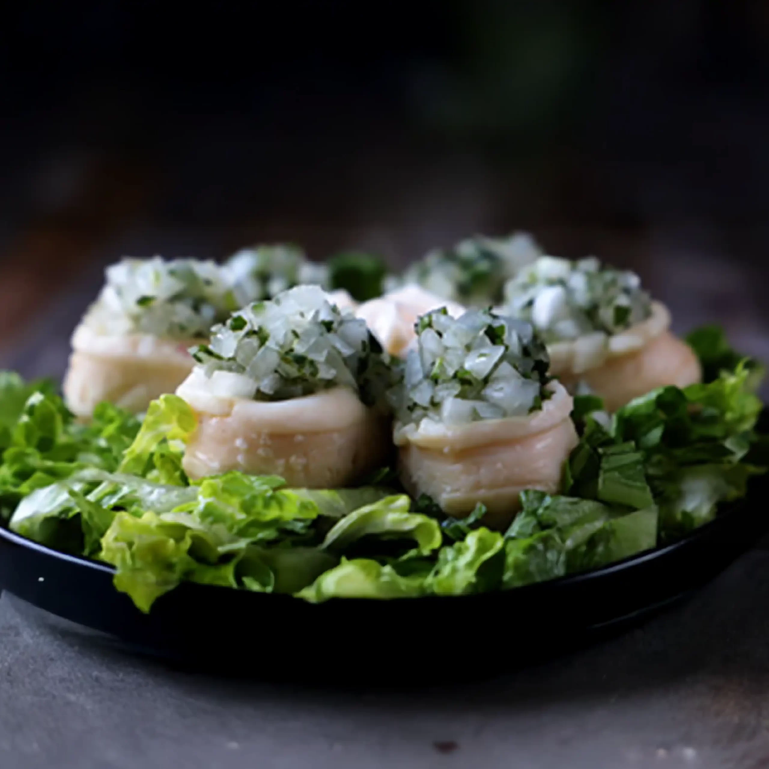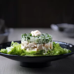- Colocar en un plato lechuga picada, luego para el timbal con la ayuda de un molde colocar en la base la palta, luego una porción de locos Raccolto, enseguida una porción de cebolla.