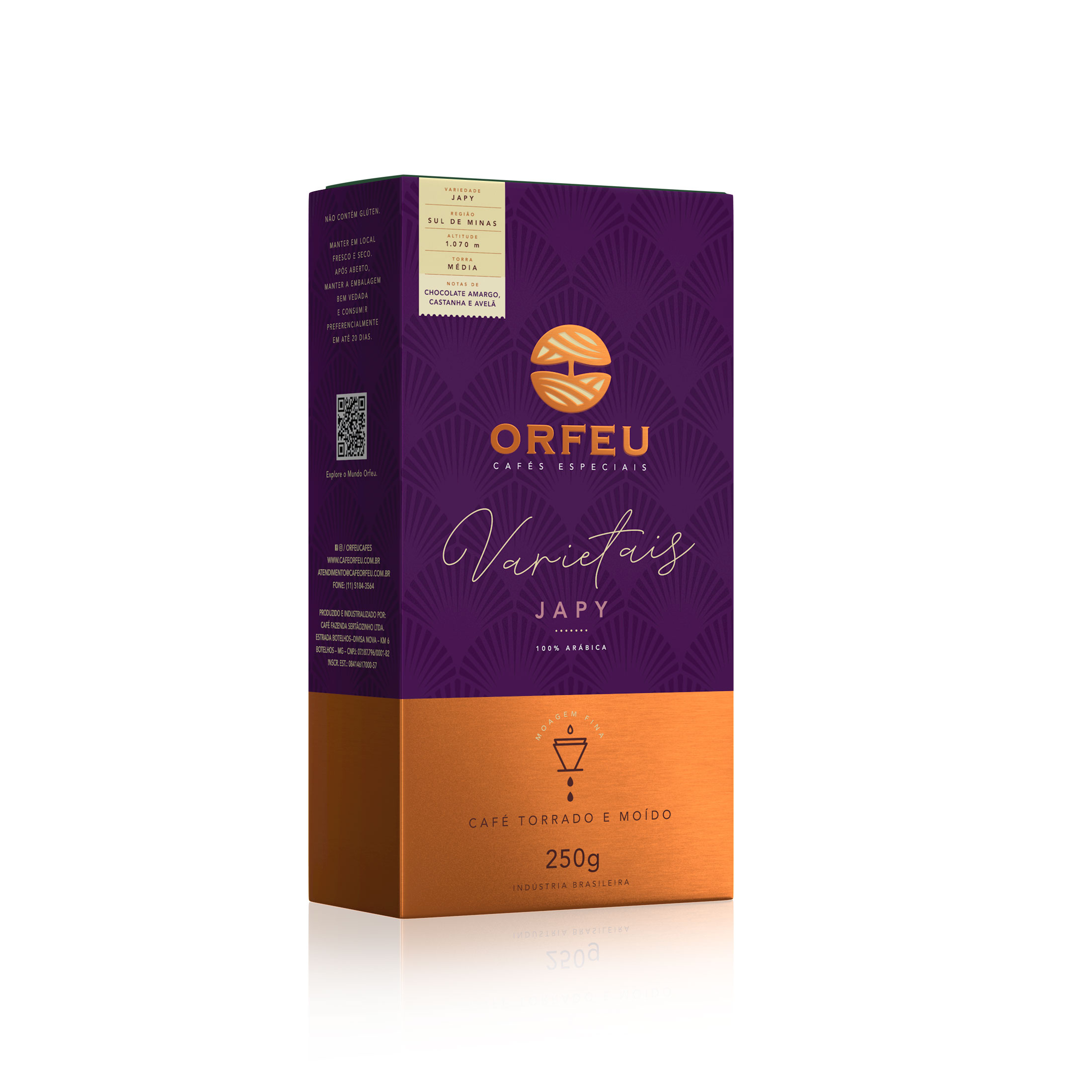 Con más de 70 años de tradición, el café Orfeu se cultiva en sus fincas Sertãozinho (1.000 a 1.300 metros), Cachoeira (1.000 a 1.150 metros) y Rainha (1.100 a 1.570 metros), ubicadas en regiones de suelo volcánico y altitudes ideales en Minas Gerais y Mogiana Paulista.